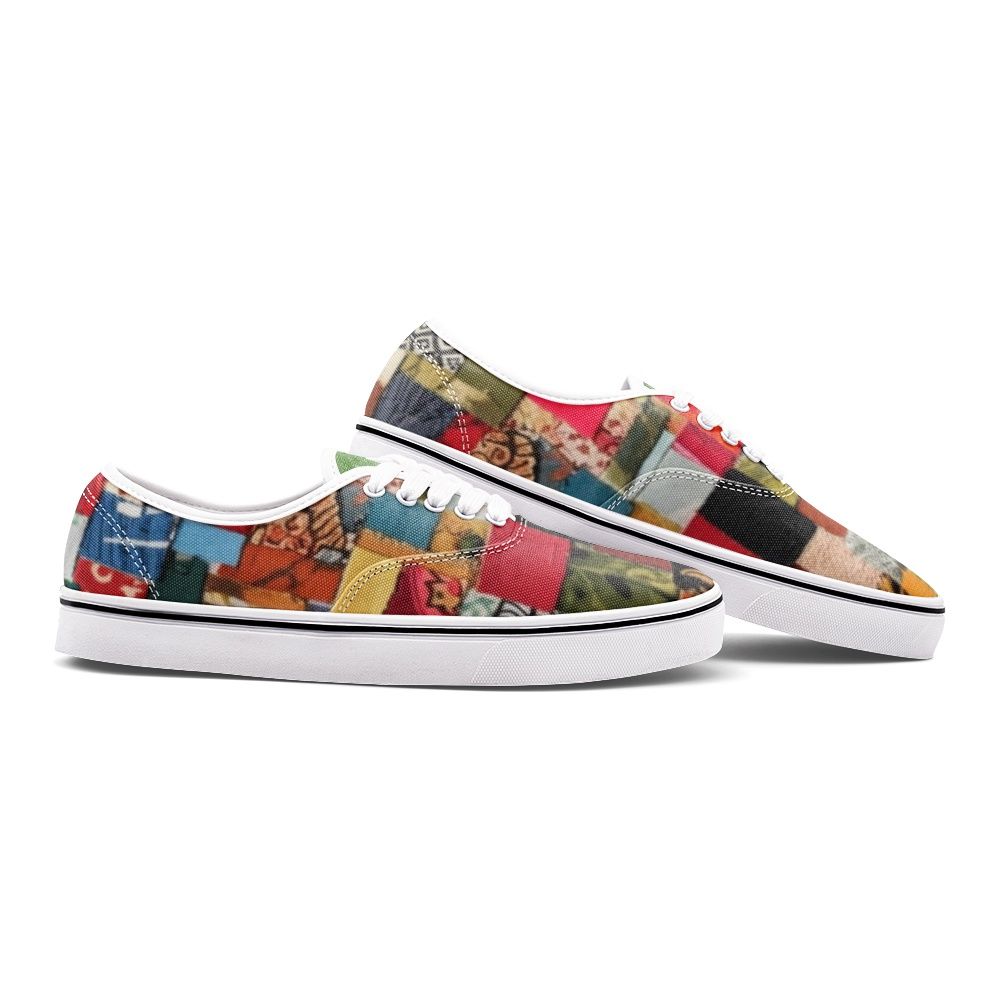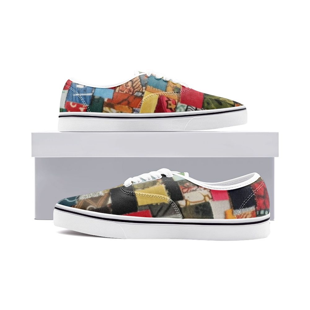 Unleash your inner artist with these playful low-top canvas shoes, featuring a vibrant patchwork of mismatched patterns and colors. Embrace the chaos and create a unique look that reflects your individuality.